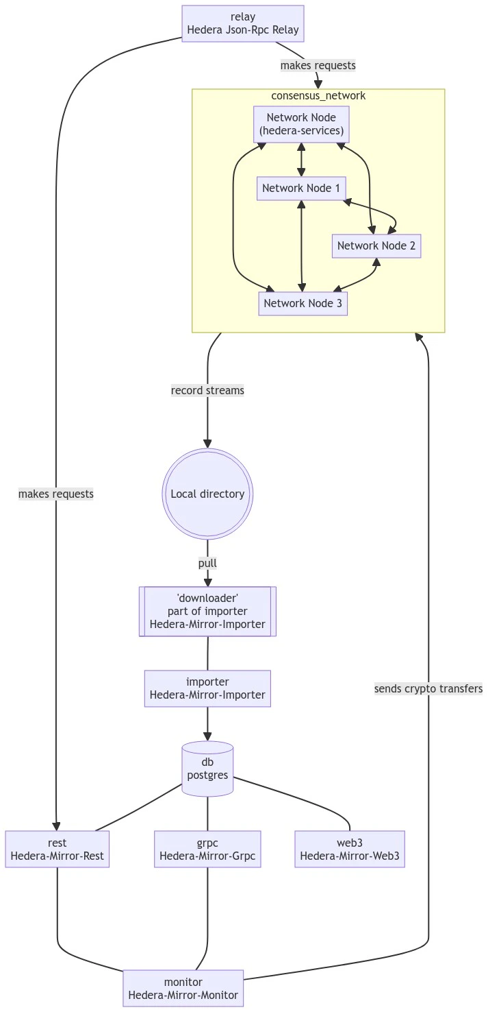 📣 Note: Creating a decentralized network where each node runs independently on its own machine is currently unsupported. Nonetheless, advanced networking and configuration capabilities are available, allowing nodes to communicate with each other similar to their interactions on the Hedera Mainnet.