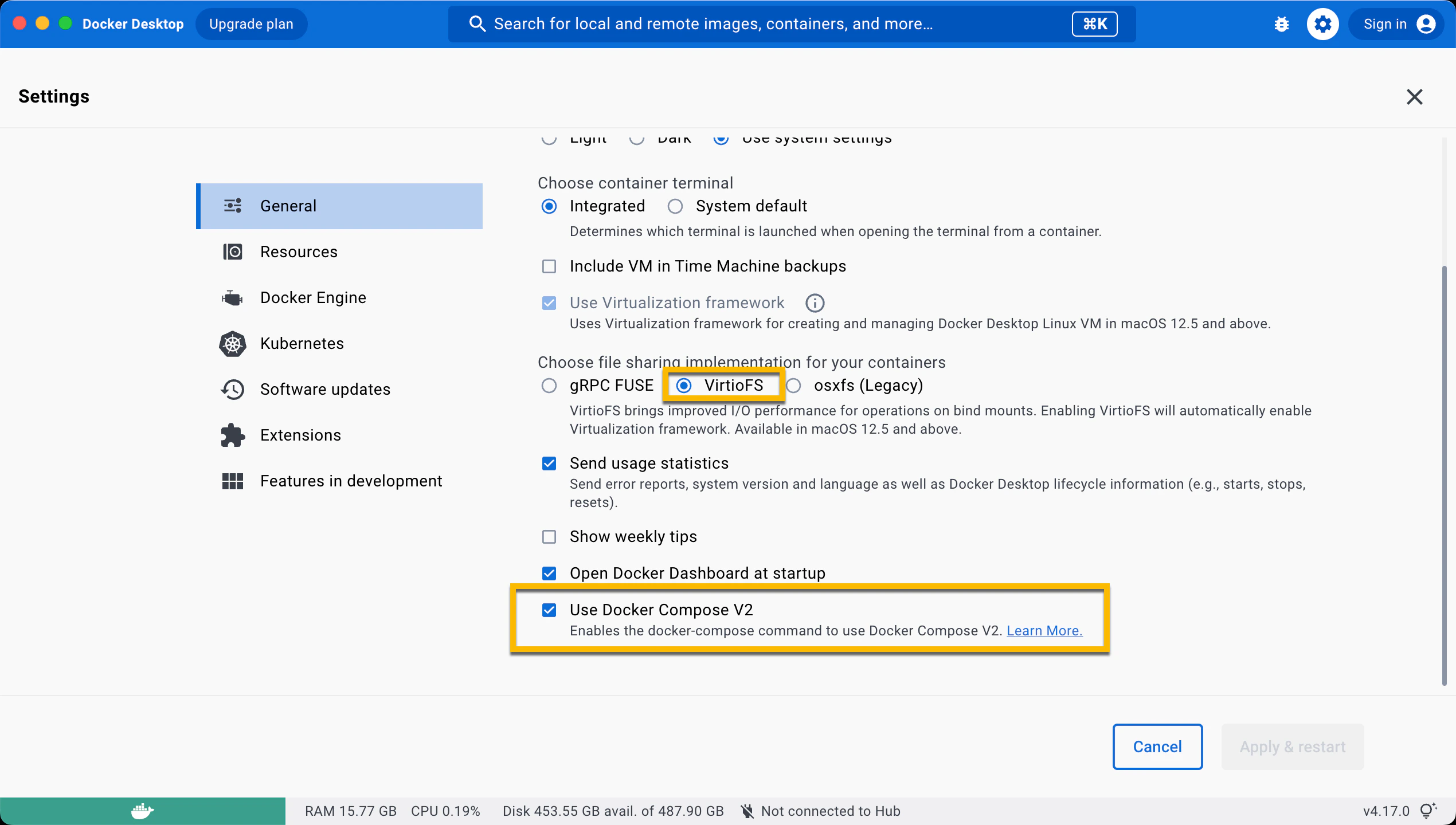 Ensure the following configurations are set at minimum in Docker Settings -> Resources and are available for use:CPUs: 6Memory: 8GBSwap: 1 GBDisk Image Size: 64 GB