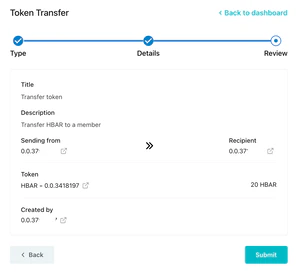 - Fill out the title, description, link to discussion, recipient account ID, and select the token to transfer and the amount.