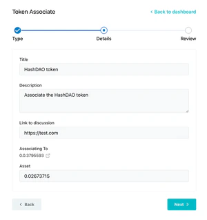 This Token Associate proposal transaction is proposing the HashioDAO token to be associated with the smart contract. Once the proposal is created, members of the DAO can vote on it to execute or reject the proposal.