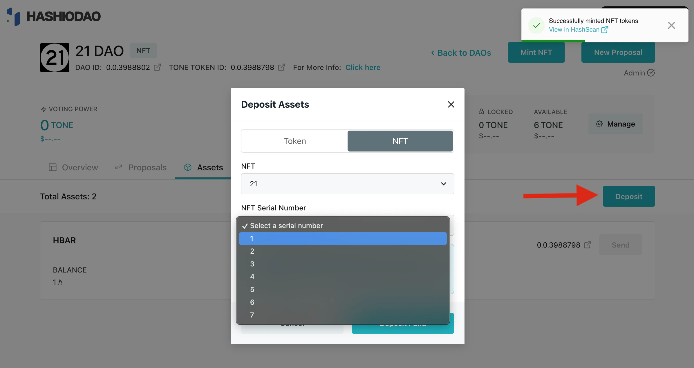 Once your DAO is created, you need to mint the NFT and deposit to the treasury to finish setting up. Click the Mint NFT button, enter the NFT URL, and click the Mint NFT Tokens button.