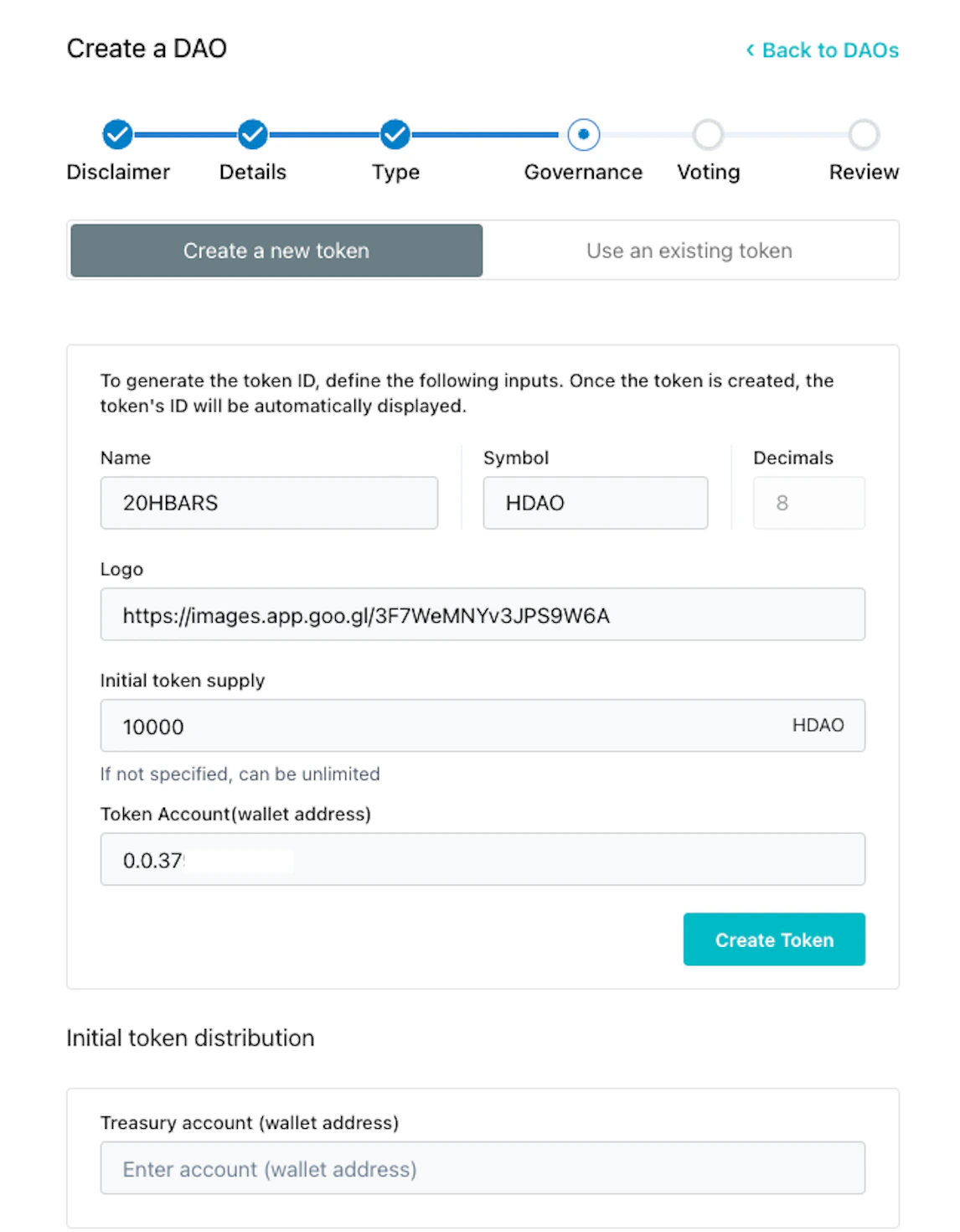 Define the DAO’s NFT and voting details. You have the option to create a new governance token or use an existing one. For the purposes of this tutorial, we will create a new one. Define the details for your new governance token: