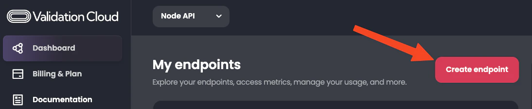 - (3) Click the “Create endpoint” button at the top of the Validation Cloud Node API dashboard: